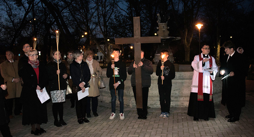 A kereszthódolat során mindannyian leborulhattunk Jézus előtt, majd a liturgia zárásaként, inkább folytatásaként – az újszegedi hívek hagyományát követve – a Ligetben végig jártuk a keresztutat. Az állomások elmélkedéseit egyházközségünk egyes csoportjainak képviselői állították össze.