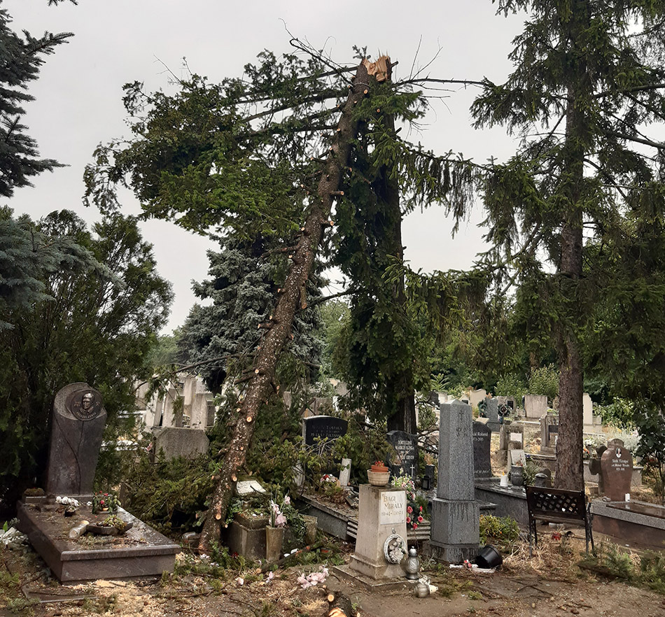 A temetőben is szükséges volt a kiszáradt fenyőfákat kivágni, hogy nagyobb bajt ne okozzon.